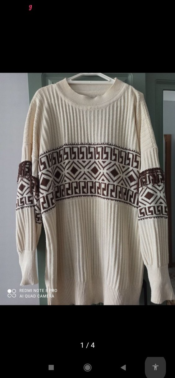 Kadınlar için nakışlı, bol kesim ve uzun kollu triko kazak. Bohem tarzında, yuvarlak yaka ve rahat dokusu ile günlük kullanıma uygun. Rengi beyaz ve gri tonlarında nakışlı. çoğu kez giyilmiş görüldüğü gibi