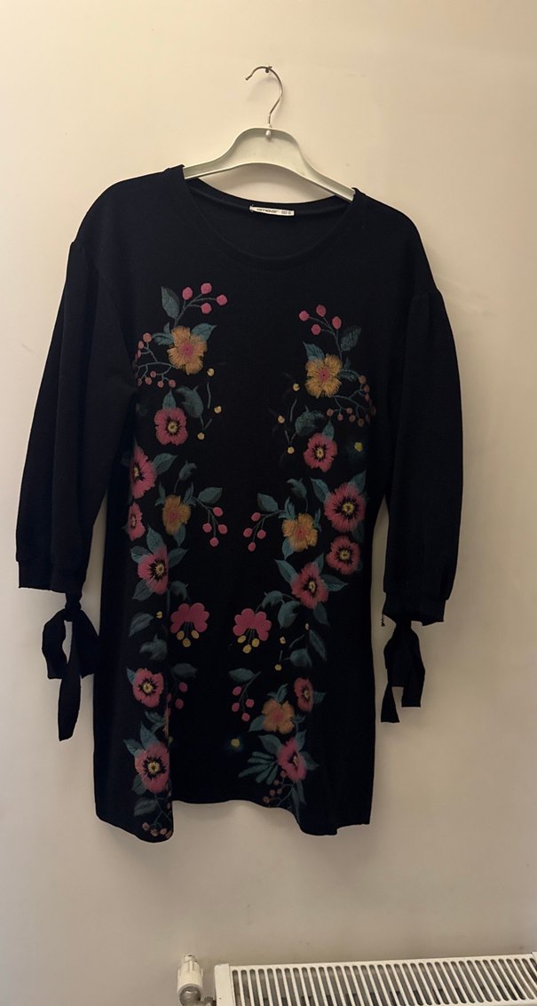 Bohem tarzda, uzun kollu ve bağcıklı manşetli, yuvarlak yakalı kadın triko tunik. Çok renkli çiçek nakışlarıyla, koyu zemin üzerinde, midi boy ve bol kesim.