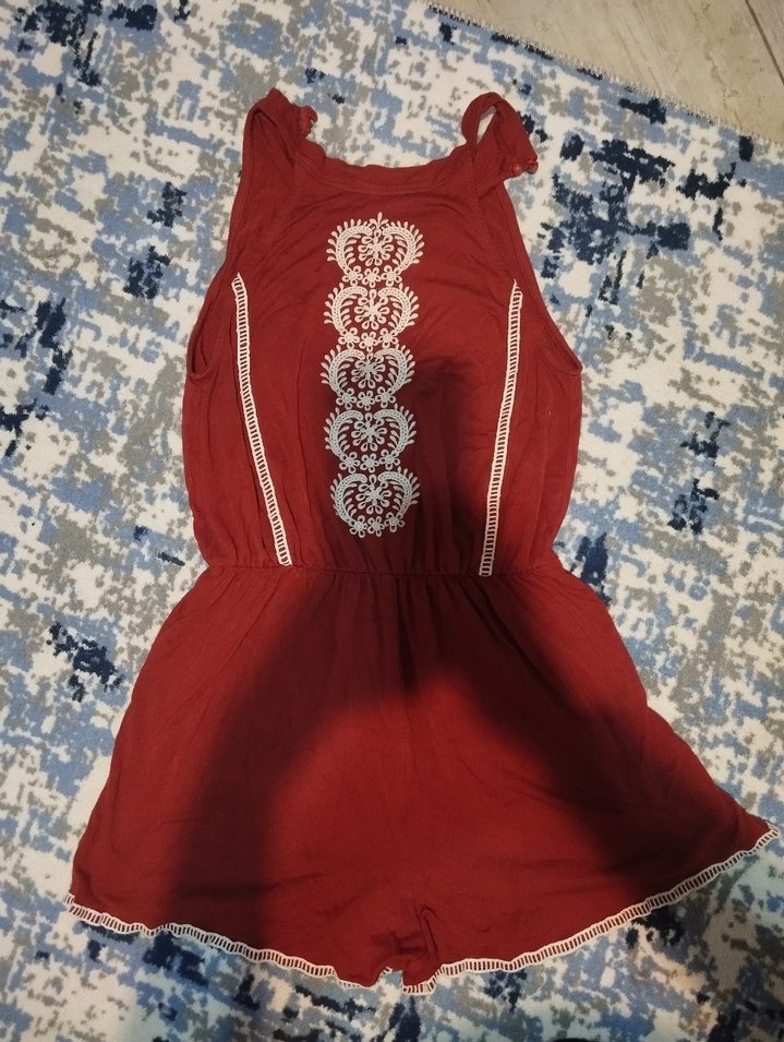 , nakışlı ve dantel detaylı, straplez yaka ve fitted kesime sahip bohem kadın tulumu. kiremit rengi