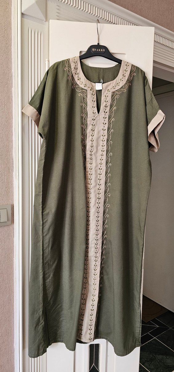 mısır'dan almıştım...hiç kullanılmadı...uzun zamandır dolap beklediği için yıkandı.. ütülendi..astarsız ama koyu renk olduğu için iç göstermiyor...sağ yanında yırtmaca yakın hafif dolap lekesi olmuş..son resime yükledim.....fiyata yansıtıldı..omuzdan boyu 113cm..96 cm'den sonra iki yanında yırtmacı var..iki kol altı göğüs ölçüsü 59 cm...44/46 rahat giyer...lütfen ölçüleri dikkate alınız..pamuklu kumaş..bol rahat bir elbise...