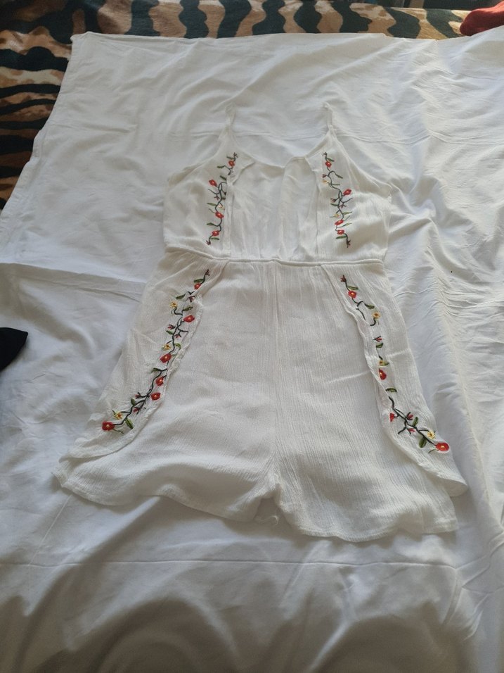 Beyaz, nakışlı çiçek desenli, kolsuz, keten kumaştan, V yaka ve bol kesim bohem mini tulum.