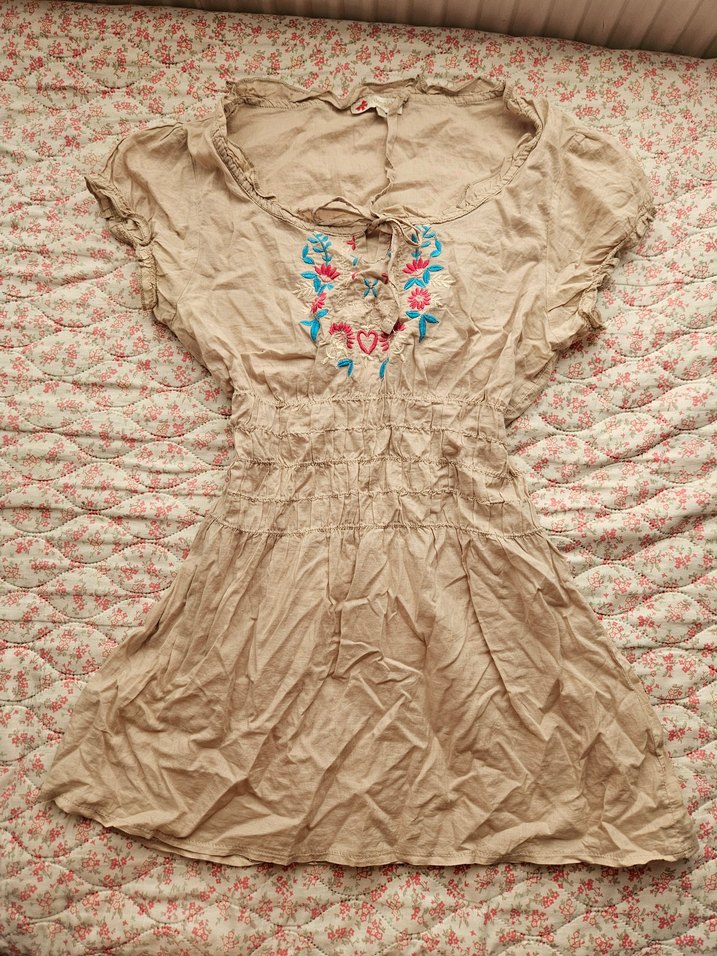 Bej keten tunik, nakışlı detaylar ve fırfırlarla süslenmiştir. V yaka, kısa kollu ve bol, midi boydadır. Bohem tarzına uygundur.