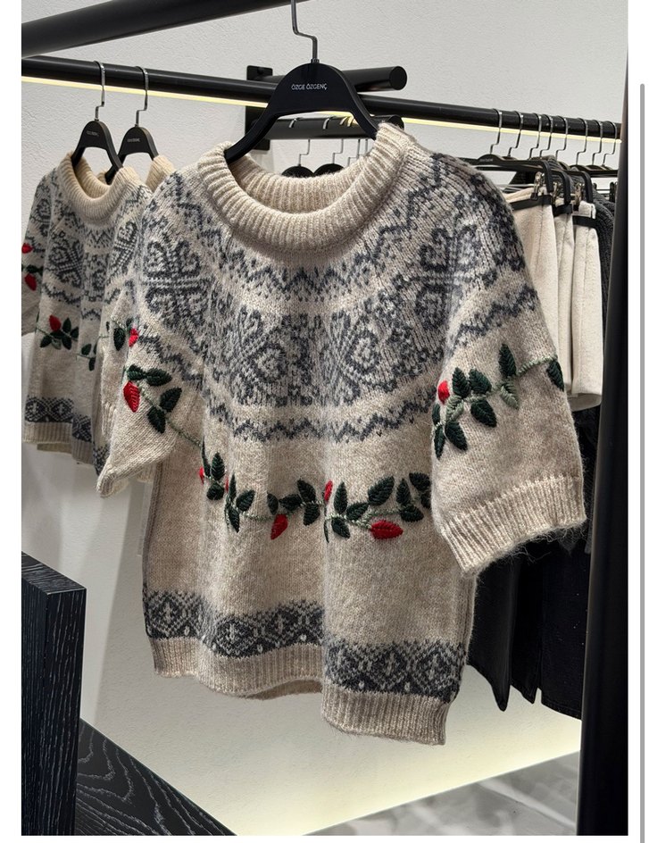 Bu kadın trikosunda kısa kollu, bohem tarzda, nakışlı gri ve beyaz desenler bulunur. Rahat kesimi ve kısa boyu ile günlük kullanıma uygundur.