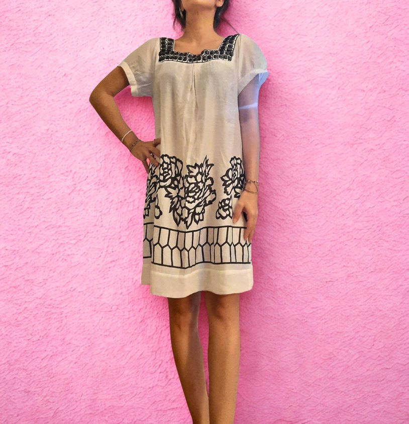 Bol kesim, kısa kollu, tekne yaka midi elbise. Nakışlı çiçek desenleri ve dantel detayları bulunur. Yumuşak kumaştan, günlük kullanıma uygun. Astarsız. iki koltuk arasi 48cm. uzunluk 92 cm.