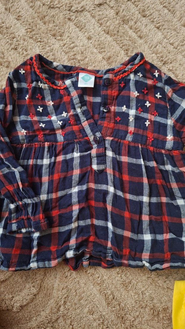 Uzun kollu, V yakalı ve düğmeli kız bluzu. Nakışlı detayları, bol kesimi ve çok renkli koyu kareli kumaşıyla bohem tarzındadır.