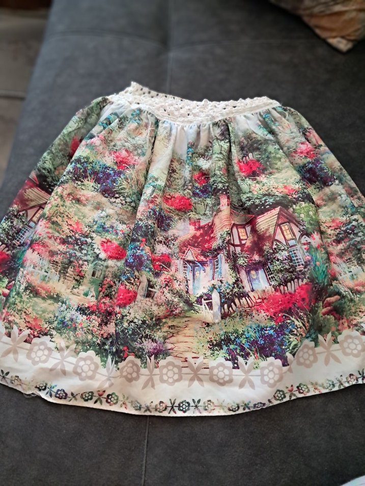 Bol kesim kız çocuk eteği, nakışlı çiçek ve ev desenleriyle, dantel detaylıdır. Pastel çok renkli kumaşı retro ve bohem tarzı yansıtır.