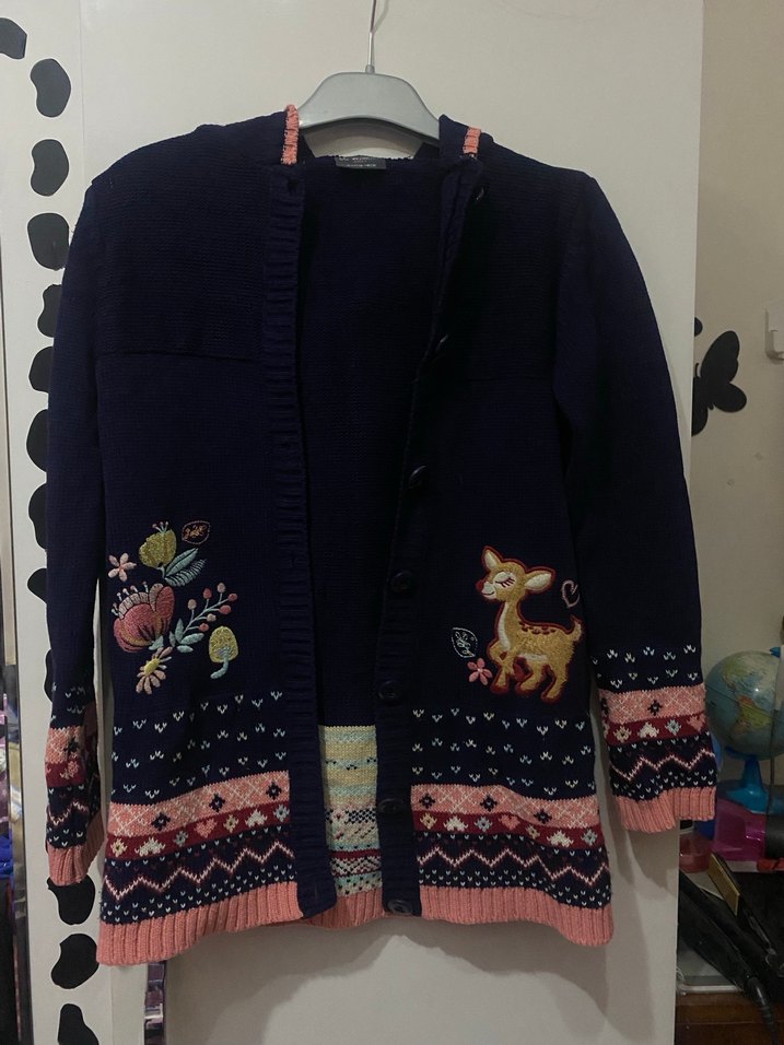 Nakışlı desenlere sahip, uzun kollu, bol kesim ve bohem tarzda çok renkli koyu tonlarda örme kız çocuk hırkası.