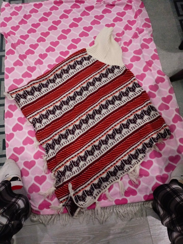 Nakışlı desenlere sahip, kayık yakalı, askılı kollu, bol kesim bohem tarzda kız çocuk triko panço.