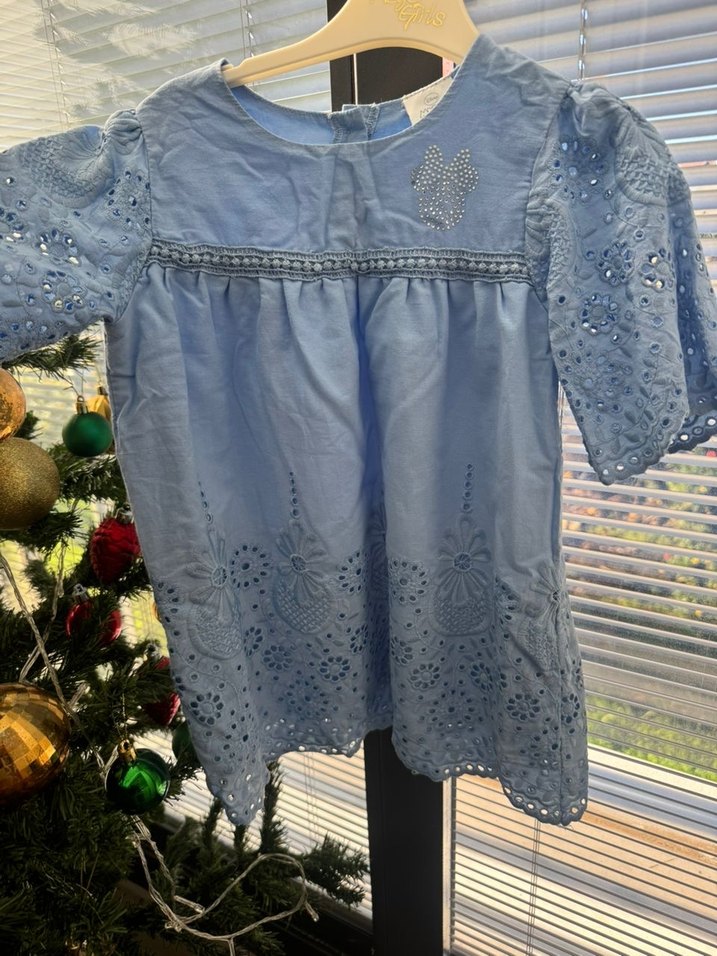 Bol kesim, kısa kollu kız elbisesi. Yumuşak dokulu kumaştan, nakışlı desenlerle ve yuvarlak yakalı. Bohem tarzda gri-mavi tonlarda. 3-4 yaş