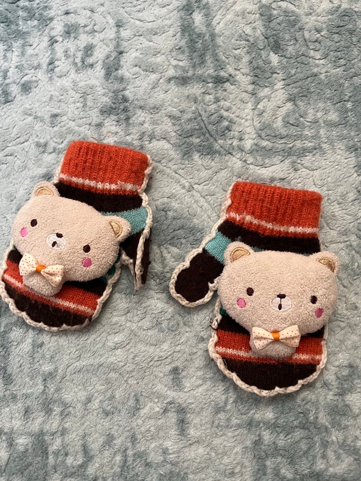 Renkli nakışlı desenlere sahip, kahverengi örgü yumuşak ve sıcak kız eldiveni. Sevimli ayı figürüyle bohem tarzda.