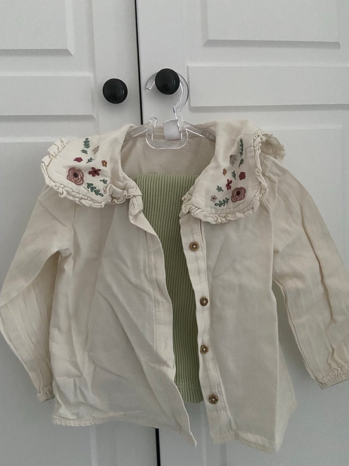 Yumuşak keten kumaştan, nakışlı yakalı ve düğmeli, bol kesim uzun kollu kız gömleği. Bohem tarzda, pastel beyaz renkte.