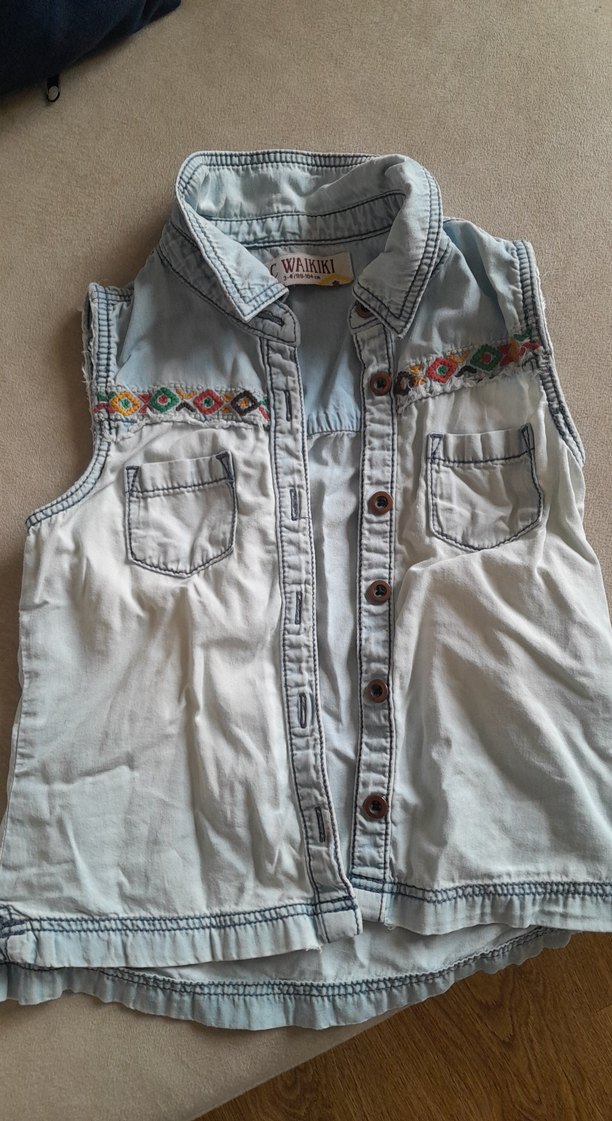 Düğmeli, renkli nakış detaylı, bol kesim, kot kumaştan yapılmış gri kolsuz bohem tarzda yelek. ✨