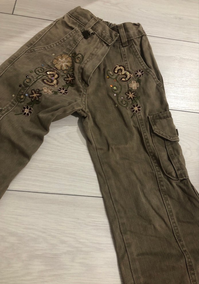 Kahverengi tekstilden yapılmış, bol kesim ve bohem nakışlı çiçek desenleriyle süslenmiş, düğmeli detaylara sahip retro tarz kız pantolonu.