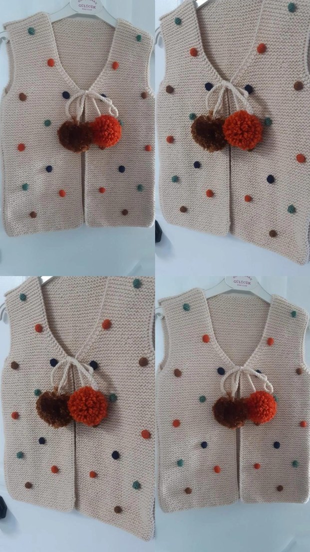 Kolsuz, V yakalı, nakışlı çok renkli puantiyelerle süslenmiş, bol kesim bohem tarzda örme kız yeleği, önünde ponpon bağcıklar bulunur.