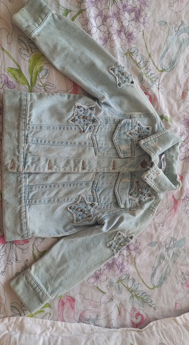 Pastel mavi renkli, uzun kollu kot ceket. Düğmeli, yakalı ve nakışlı yıldız desenleriyle bohem vintage tarzını yansıtır.