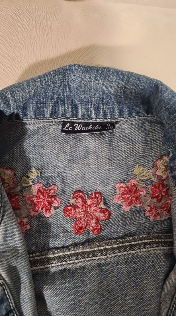 Nakışlı çiçek desenleri ve düğmeli kapanışa sahip, bol kesim uzun kollu denim ceket. Notlu yakalı, vintage esintili bohem tarz. etiketi 8 ama 7 yaş için daha uygun