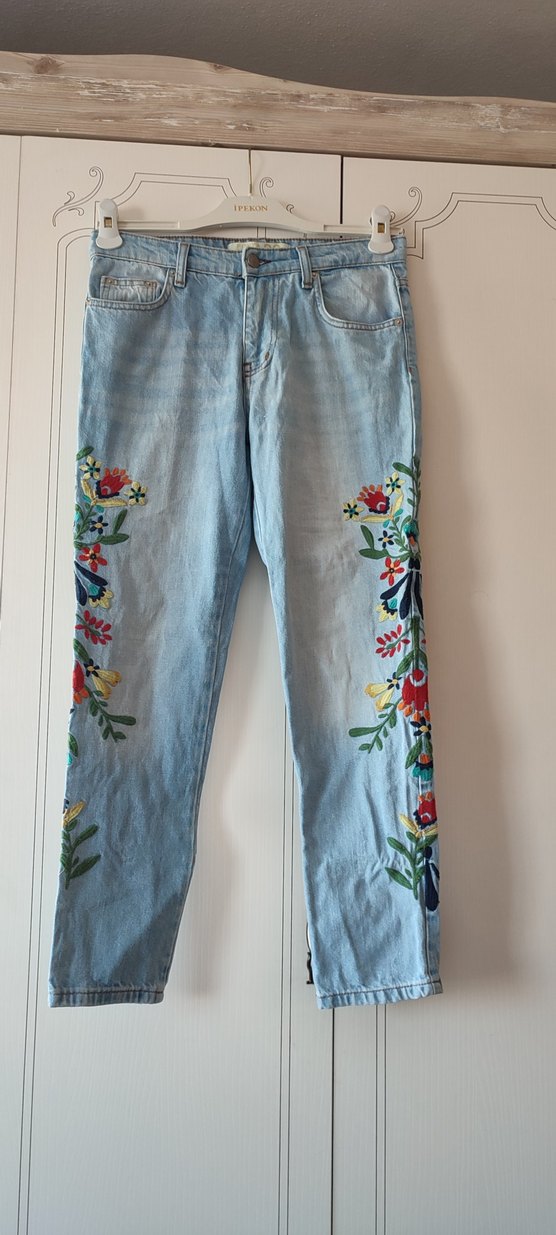 Renkli çiçek nakışlı, açık mavi denim pantolon. Bol kesim, düğmeli ve midi boyda, bohem tarzına uygun.