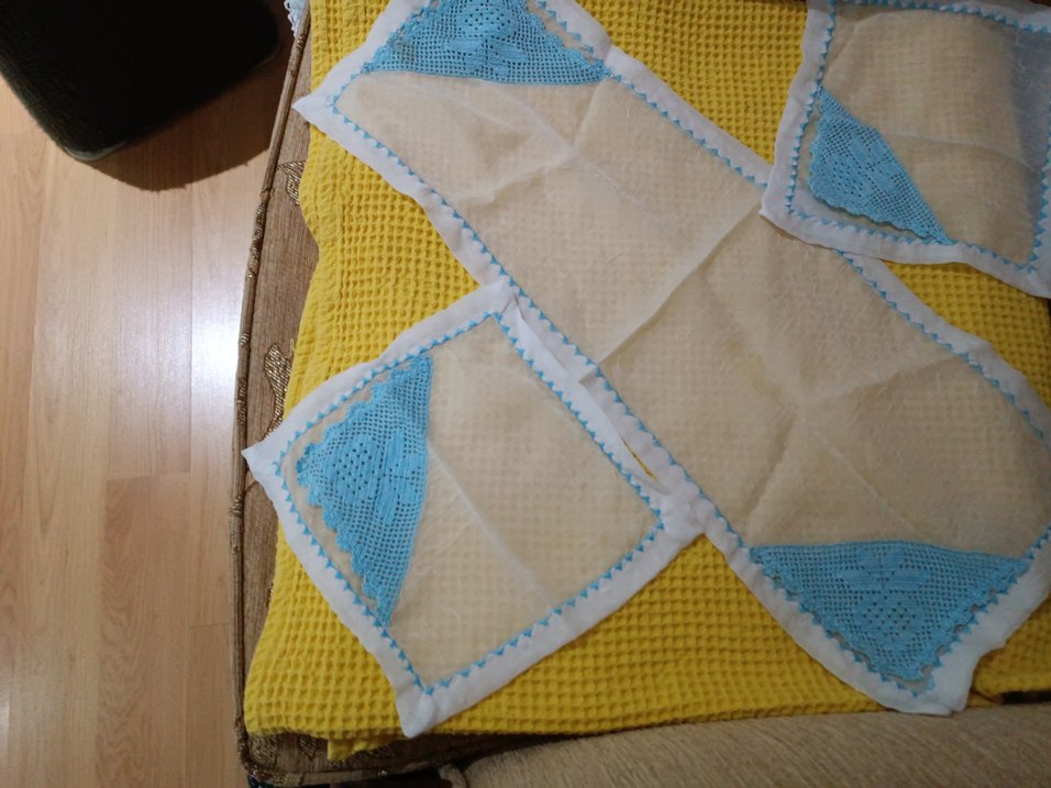 Bu mutfak bezi, pastel mavi nakışlı köşeleri ve bohem tarzıyla, yumuşak kumaştan üretilmiştir.