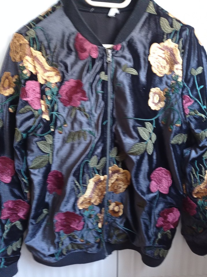 Sentetik kumaştan, nakışlı renkli çiçek desenli, uzun kollu, fermuarlı, bohem tarzda bol kesim midi kadın ceket.ic kısmında hafif tüylenme var ama dış kısmında sıkıntı yok s beden diyor ama l bedende tercih edebilir