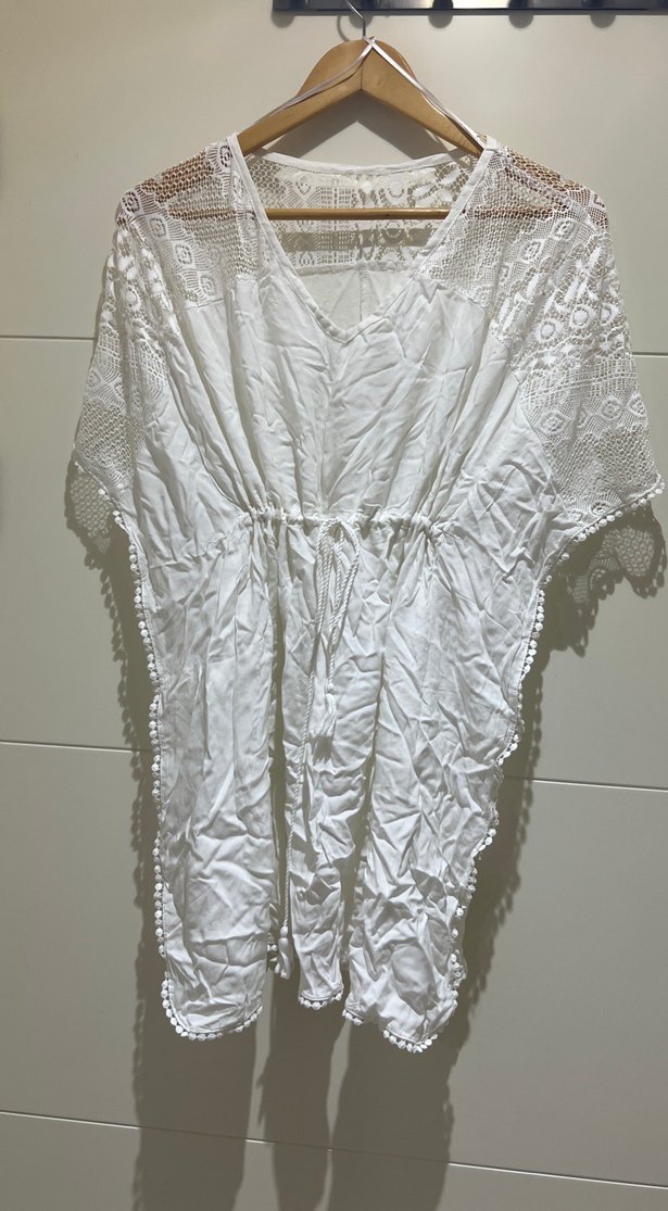 Bu beyaz bohem midi elbise, nakış detayları, kısa kollu ve bol kesimi ile rahat ve ferah bir stil sunar.