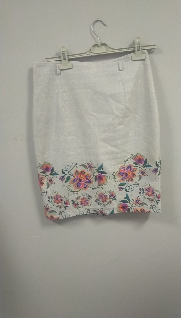 Beyaz renkli, nakışlı çiçek desenlerine sahip, bol ve drapeli hamile eteği. Mini boyda ve bohem tarzında, günlük kullanıma uygun.