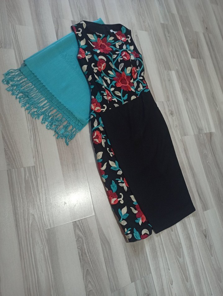 Nakışlı çiçek desenli, turkuaz renkli, kolsuz mini kalem elbise. Kayık yaka ve drapeli tasarıma sahip.