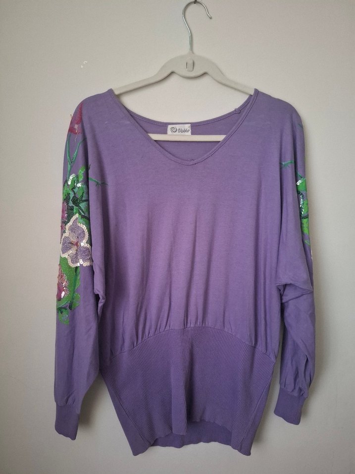Bu bol kesim mor , uzun kollu ve kollarında nakışlı çiçek desenlerine sahiptir. Yuvarlak yakalı ve yumuşak örme kumaştan üretilmiştir, bohem tarz için uygundur. penyedir.