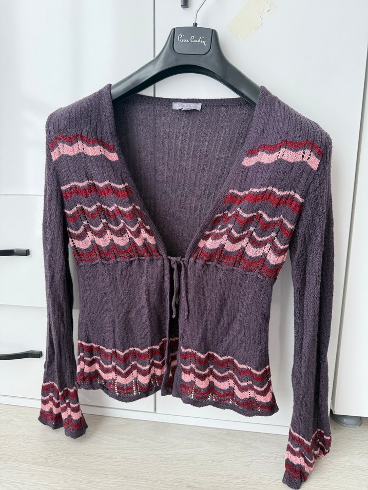 Uzun kollu, V yakalı mor örgü hırka, nakışlı dalga desenleriyle. Fitted kesim ve midi boyda, bohem tarzda rahat bir parça. Günlük kullanıma uygun.