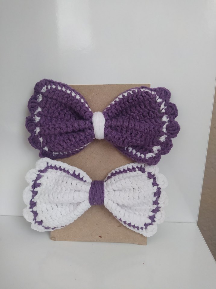 Renkli mor ve beyaz nakışlı bohem fiyonk şeklinde çocuk saç tokaları. 2 adet lastikli saç tokası.