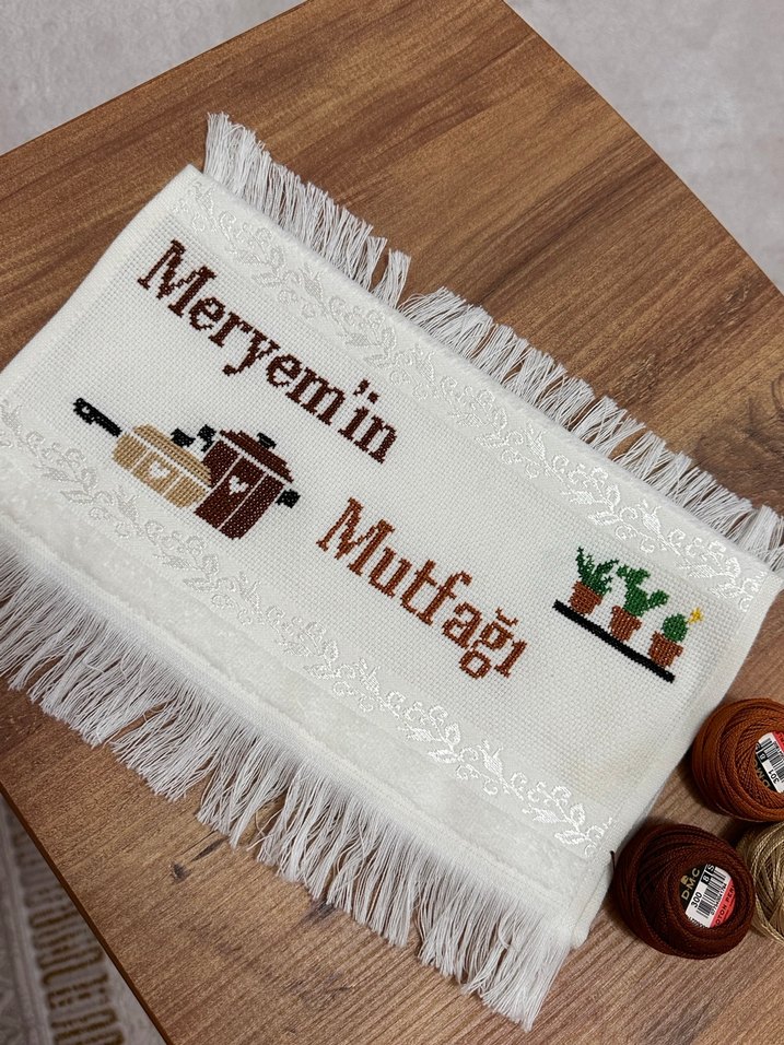 Beyaz renkte, hafif bohem tarzda nakışlı mutfak havlusu kişiye özel yapılır :)