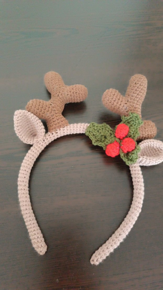Bej renkte, nakışlı geyik boynuzları ve renkli süslemelerle bohem tarzda örgü saç bandı.