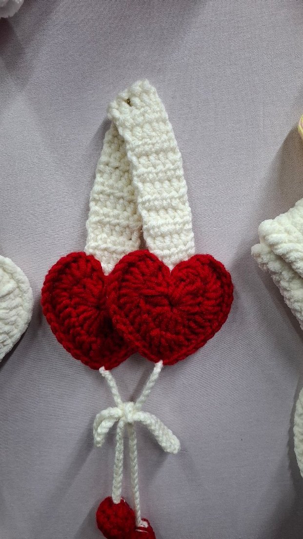 Renkli nakışlı kırmızı kalp detaylı, örgü kadın kulaklık, bohem tarzda.