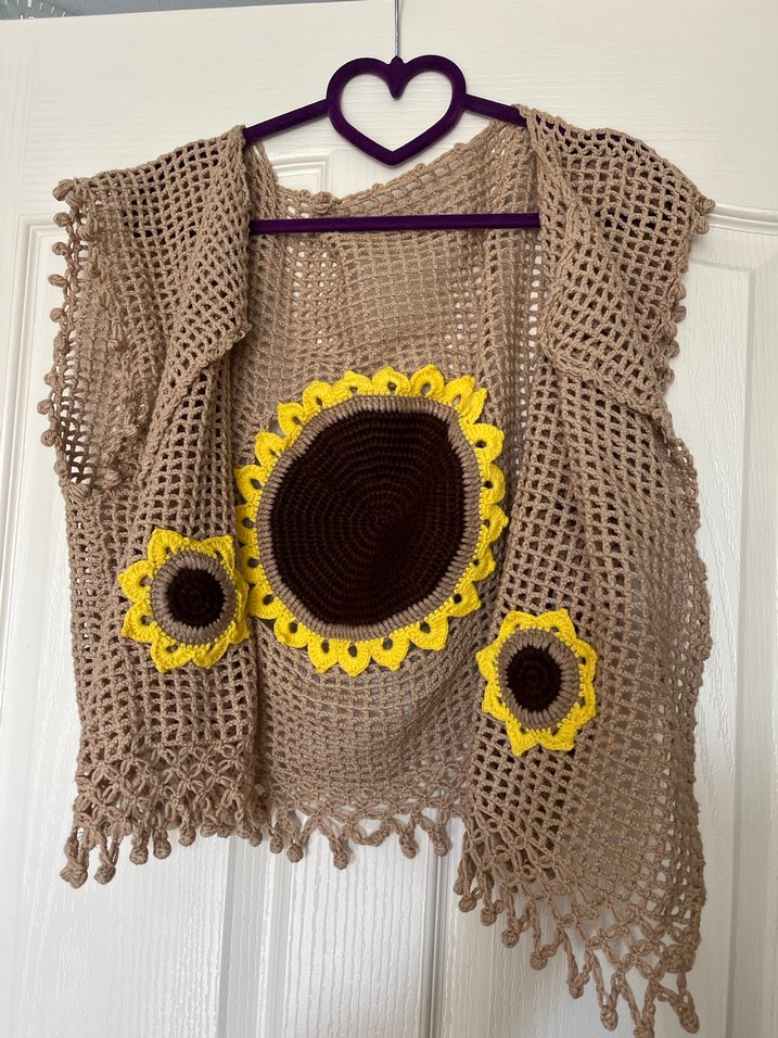 Nakışlı ayçiçeği desenli, salaş kesim ve yuvarlak yaka kolsuz örgü yelek. Bohem tarzda, günlük kullanıma uygun midi boyda.