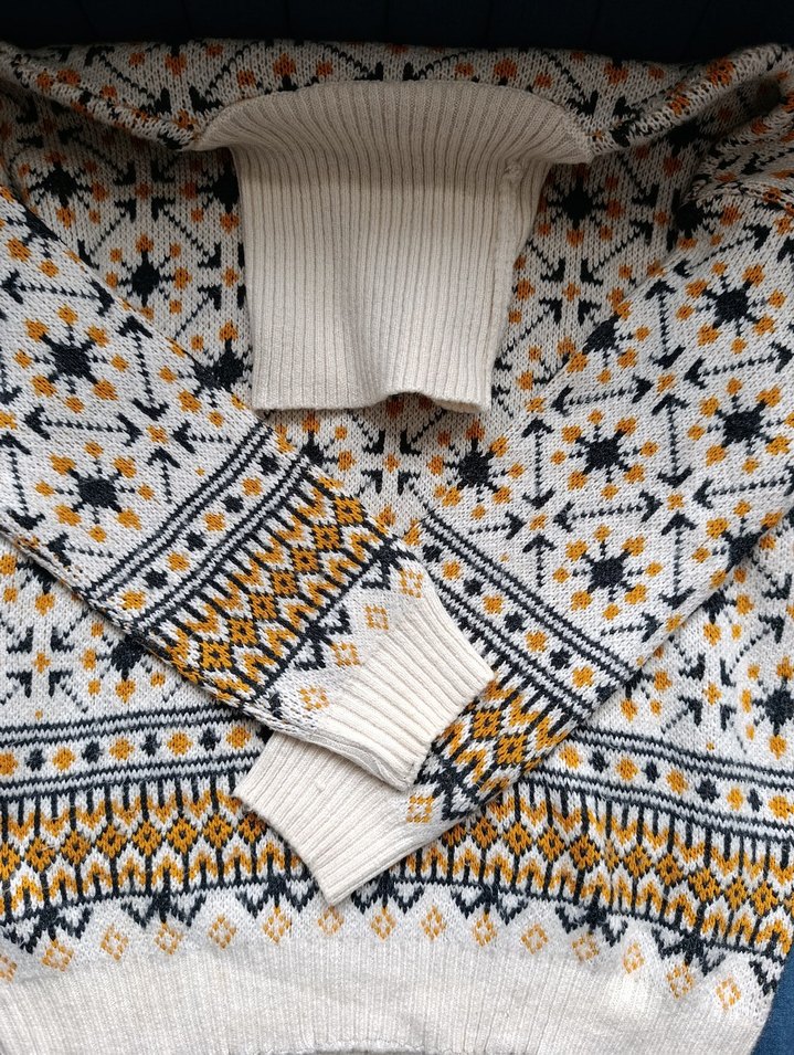Gri ve beyaz renkte, nakışlı desenlere sahip bohem tarzda örgü unisex kazak