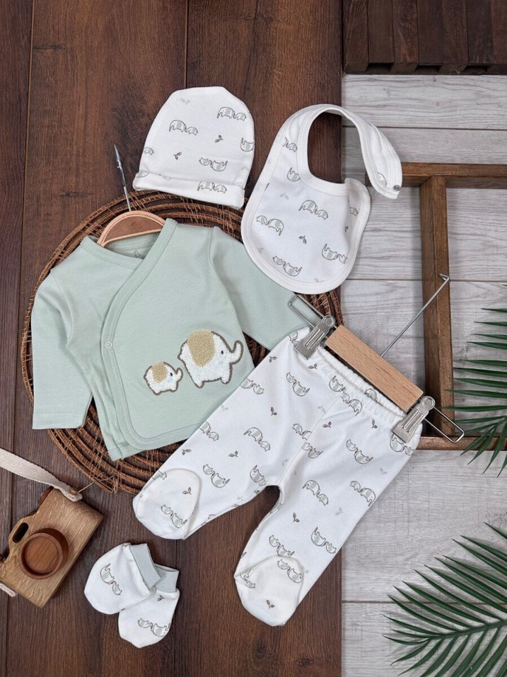 Nakışlı fil detaylı, uzun kollu pamuklu bebek takımı. Bohem tarzda, pastel renkli, örgü dokulu üst, pantolon, şapka, önlük ve patik içerir.