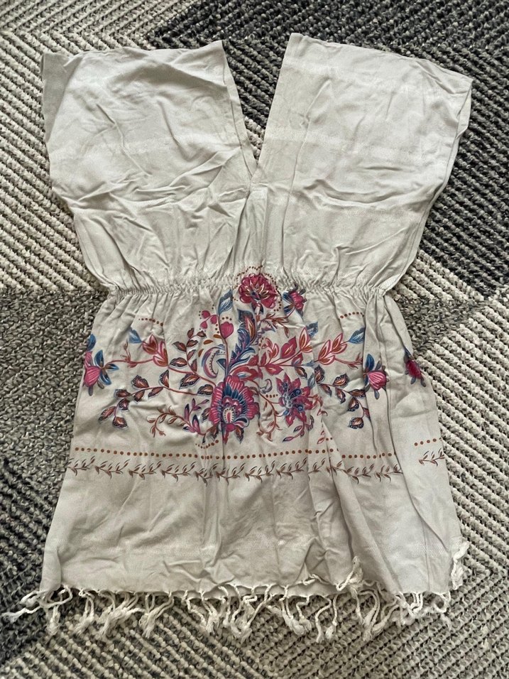 Uzun, kolsuz pareo, bol kesim ve drapeli detaylarla. Gri kumaş üzerine çok renkli nakışlı çiçek desenleri ve püsküllü etek ucu bulunur. V yaka, bohem ve retro tarzda.