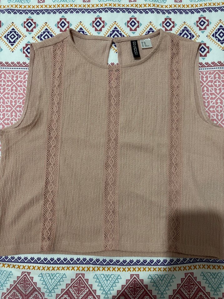Pudra renkli kolsuz bluz, yuvarlak yaka ve bol kesime sahiptir. Örgü dokulu tekstil malzemeden yapılmış olup nakış detaylarıyla bohem tarzı yansıtır. Günlük kullanıma uygundur.
