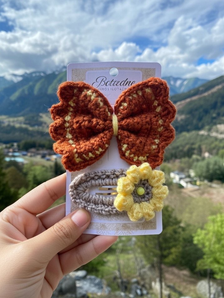 Nakışlı renkli fiyonk saç bandı ve çiçek toka seti, bohem tarzı için uygundur. Kahverengi tonları doğal bir görünüm sağlar.