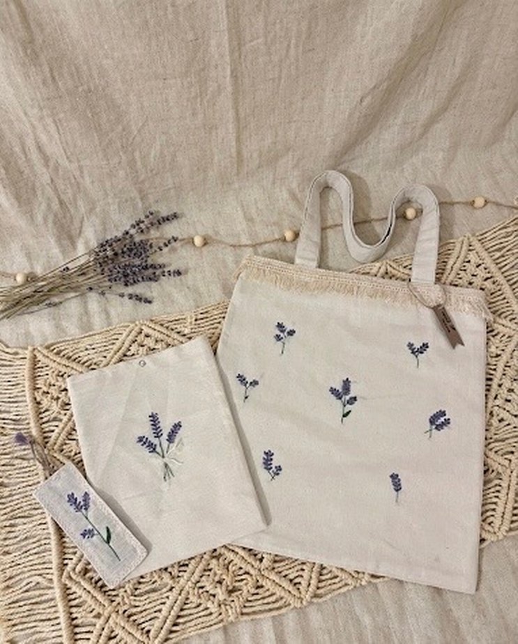 Bej renkli, el emeği lavanta nakışlı ve dantel detaylarıyla bohem tarzda astarlı lüks bez çanta, kitap kılıfı ve içi lavanta kurusu dolu kitap ayracı. İster hediyelik, ister kullanımlık! -fiyata kargo ücreti dahildir-