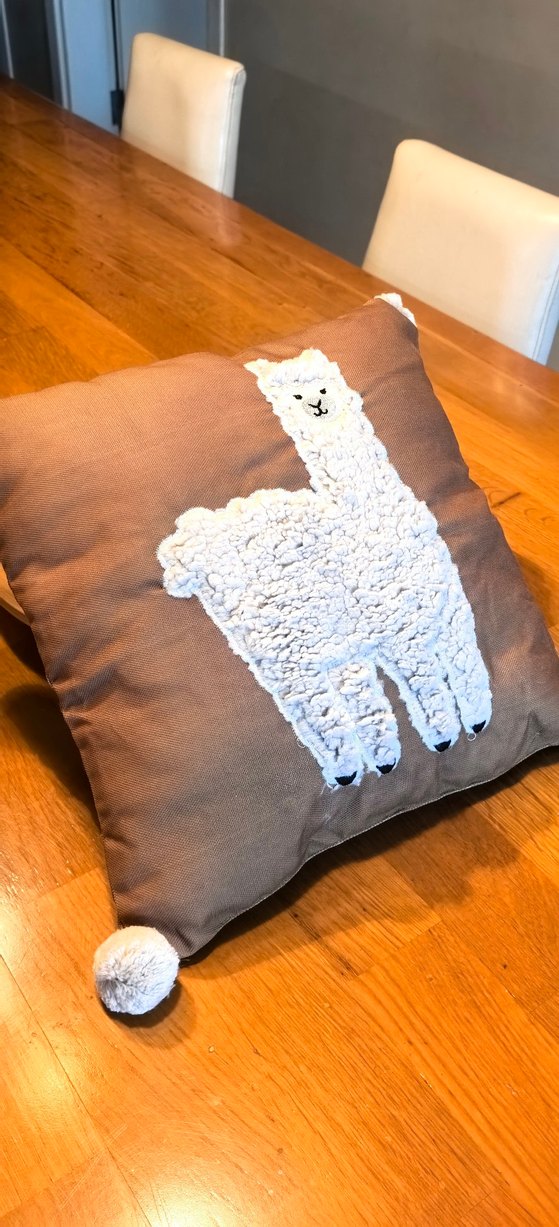 Bohem tarzda, bej renkte, beyaz lama nakışlı yastık. Yumuşak pastel tonlar ve ponpon detayları bulunur.