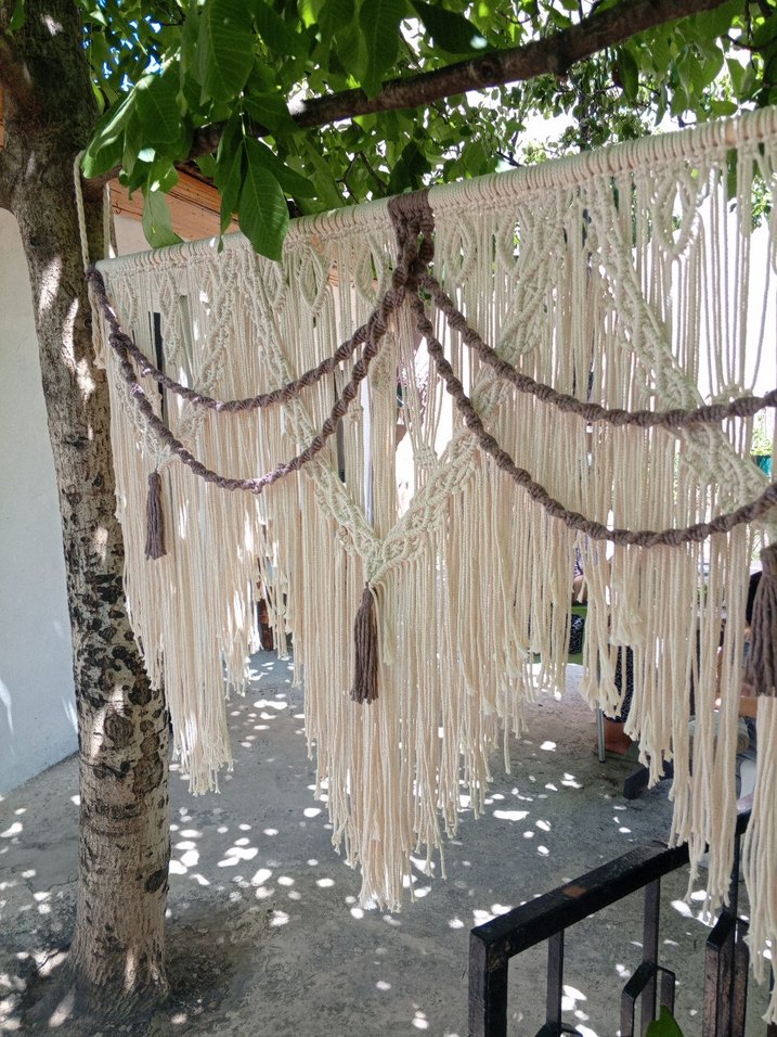 Nakışlı desenlere ve gri detaylara sahip bej bohem tarzı makrome perde, doğal ve sanatsal bir hava katar.