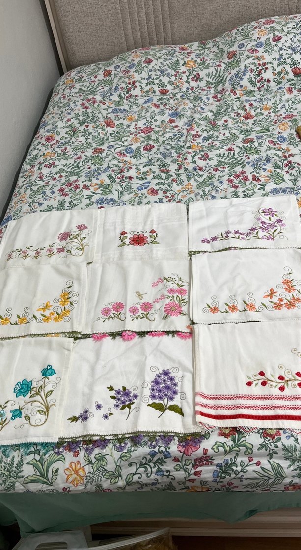 Pastel tonlarda, bohem tarzda çiçek işlemeleri bulunan yumuşak dokulu 9 parça set çeyizlik mutfak havluları. Sondaki görseldeki 2 tanesinde renk bozulması ve leke var onları da isterseniz yanında hediye ederim
