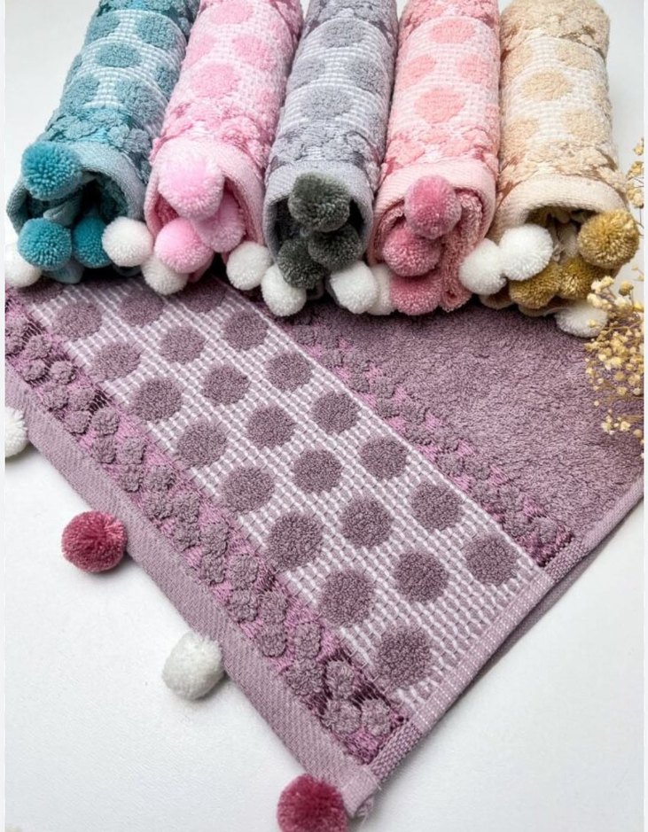 Pastel renklerde nakışlı desenlere ve ponpon süslemelere sahip, bohem tarzda yumuşak dokulu havlular.