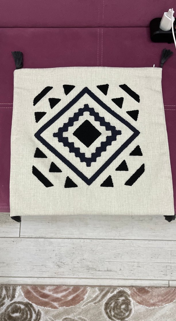 Köşelerinde püsküller bulunan, bohem tarzda çok renkli nakışlı geometrik desenli dokulu kumaş kırlent kılıfı. ️