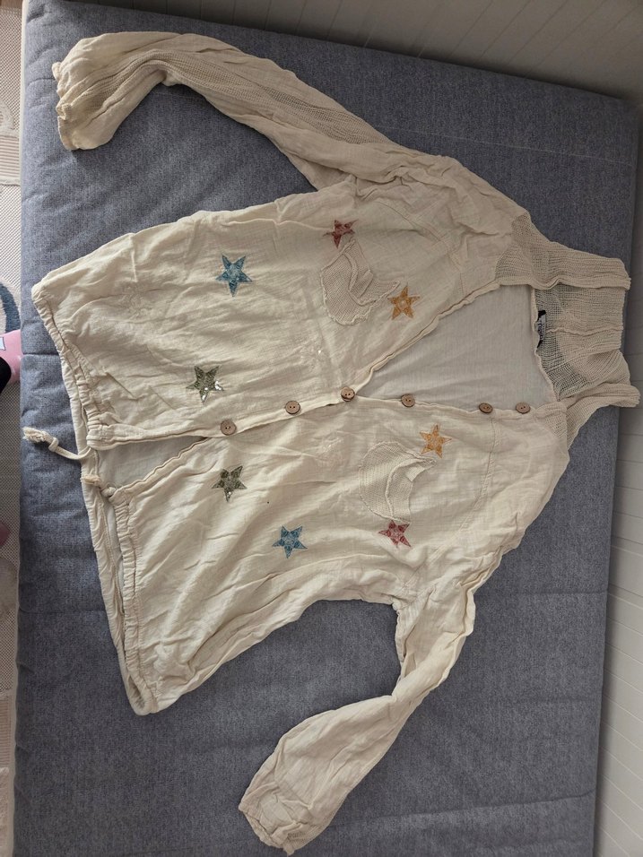 Rahat kesim, düğmeli keten gömlek, uzun kollu ve yakalı, renkli nakışlı yıldız detaylarıyla bohem tarzı için uygundur.