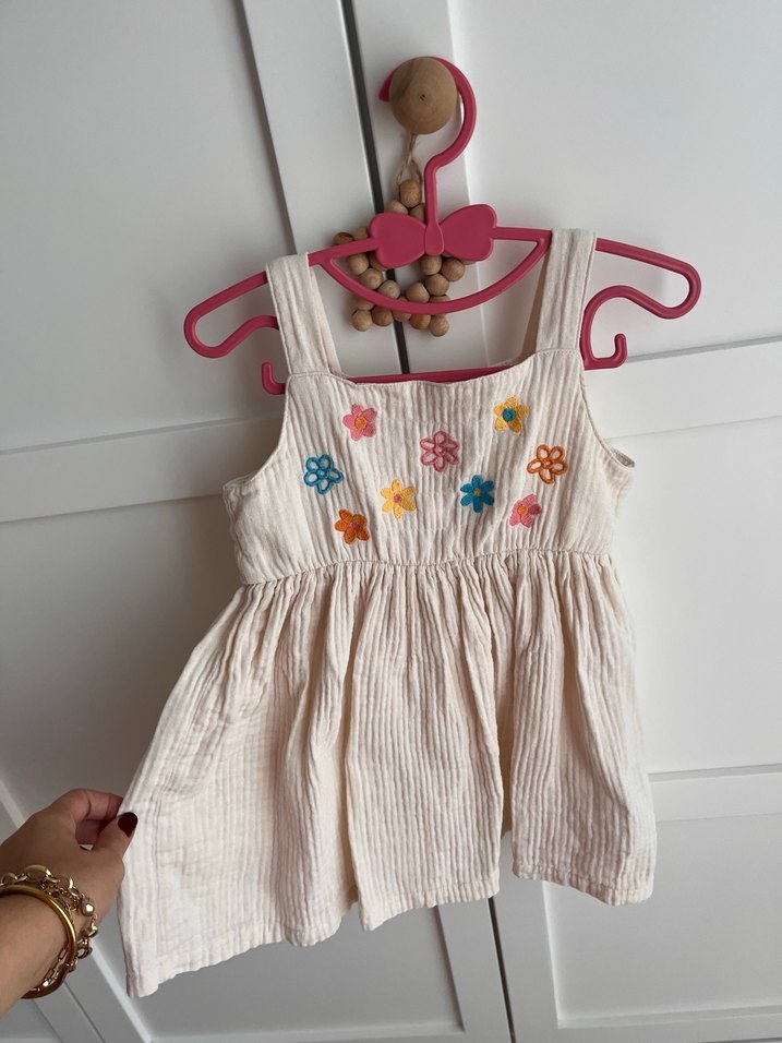 Yumuşak kumaştan, nakışlı çiçek desenli, düğmeli ve bol kesim beyaz kız çocuk elbisesi.