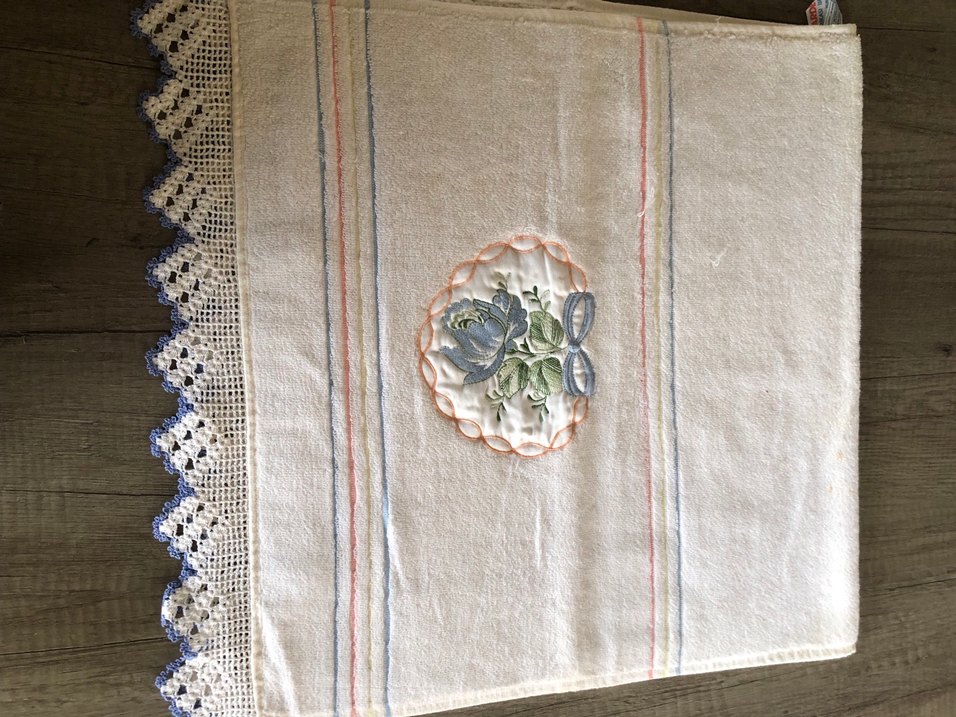 Beyaz havlu, pastel renkli çizgiler ve bohem tarzda zarif nakışlı çiçek detaylarına sahiptir. Sandık lekesi var gösterdim…