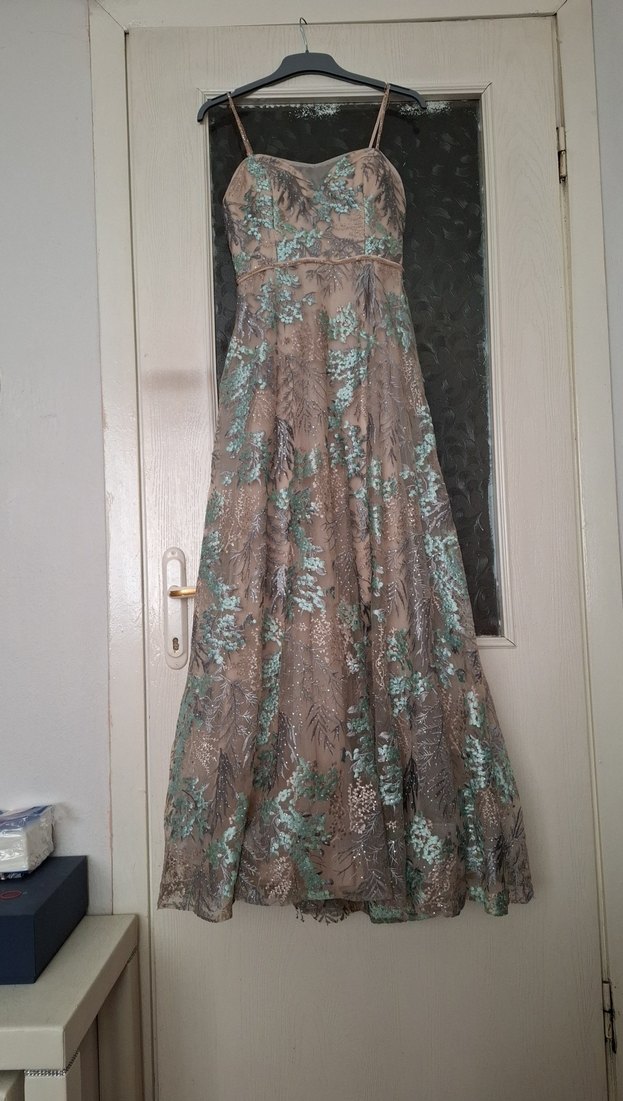 İnce askılı, nakışlı ve bohem tarzda uzun bej abiye elbise, rahat kesimiyle düğünler için uygundur. İki kol arası 40 bel 34 boy 146 cm.