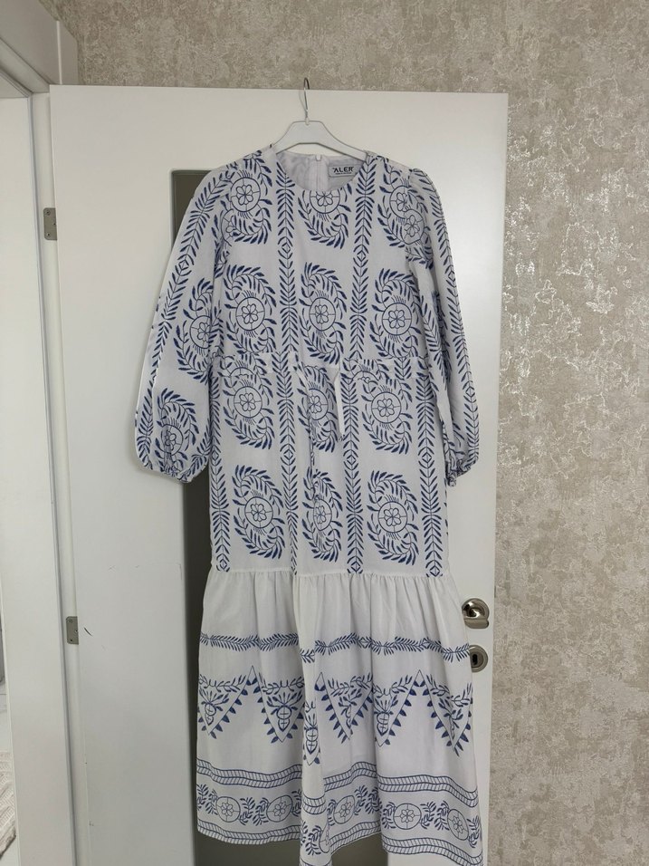Nakışlı desenlere sahip beyaz uzun elbise, bol kesim, uzun kollu ve fırfırlı detaylıdır. Yuvarlak yakalı, bohem tarzda bir modeldir.