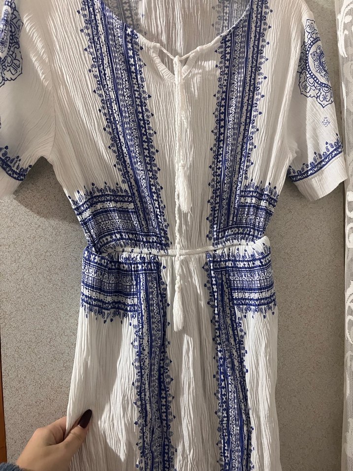 Mavi nakışlı, kısa kollu, bol kesim uzun beyaz elbise, bohem tarzını yansıtır ve rahat bir kullanım sağlar.